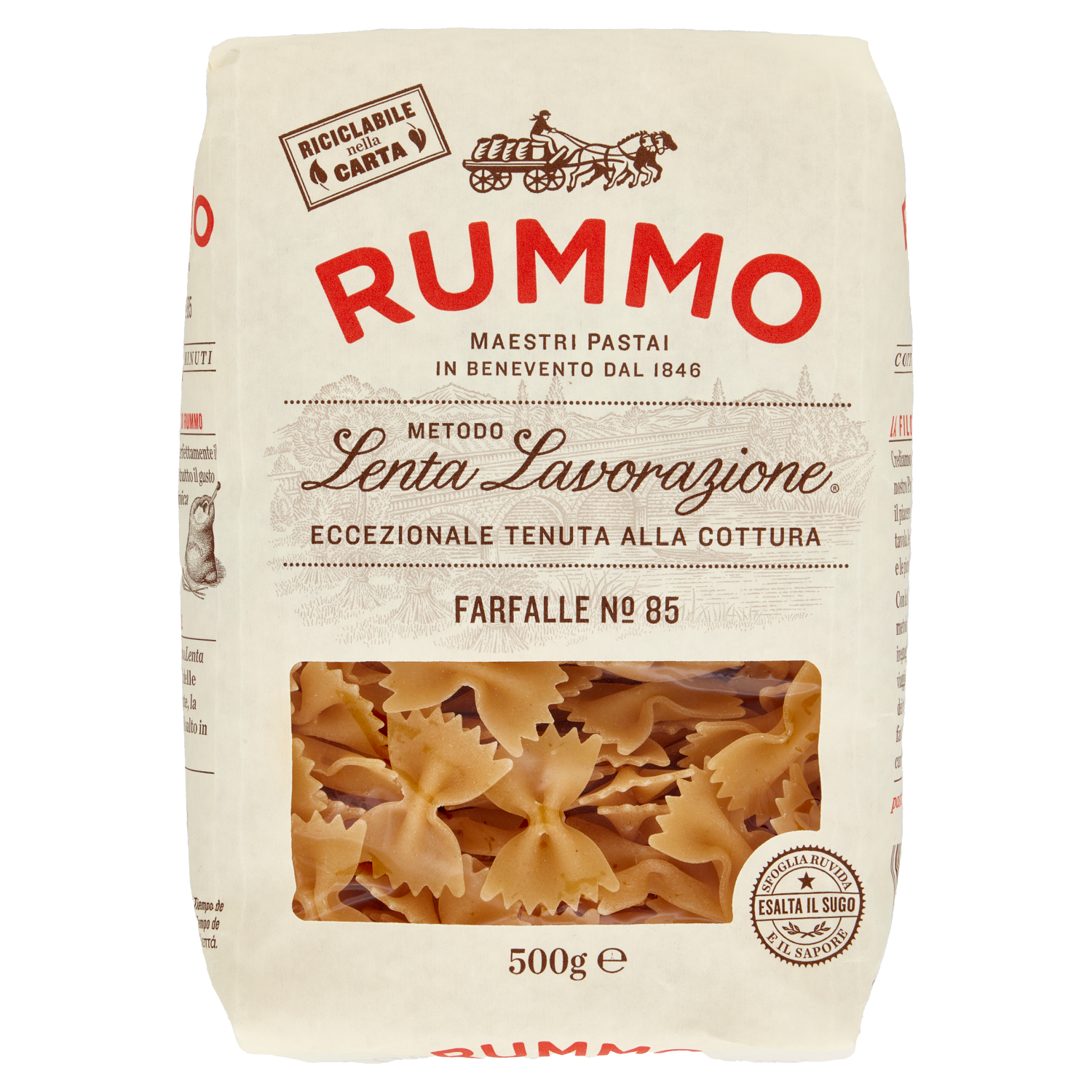 Italienische Schmetterlingsnudeln aus traditioneller Rummo-Qualität, gefertigt aus hochwertigem Hartweizengrieß. Die charakteristische Farfalle-Form mit leicht gerillter Oberfläche nimmt Saucen optimal auf und sorgt für ein harmonisches Geschmackserlebnis.
