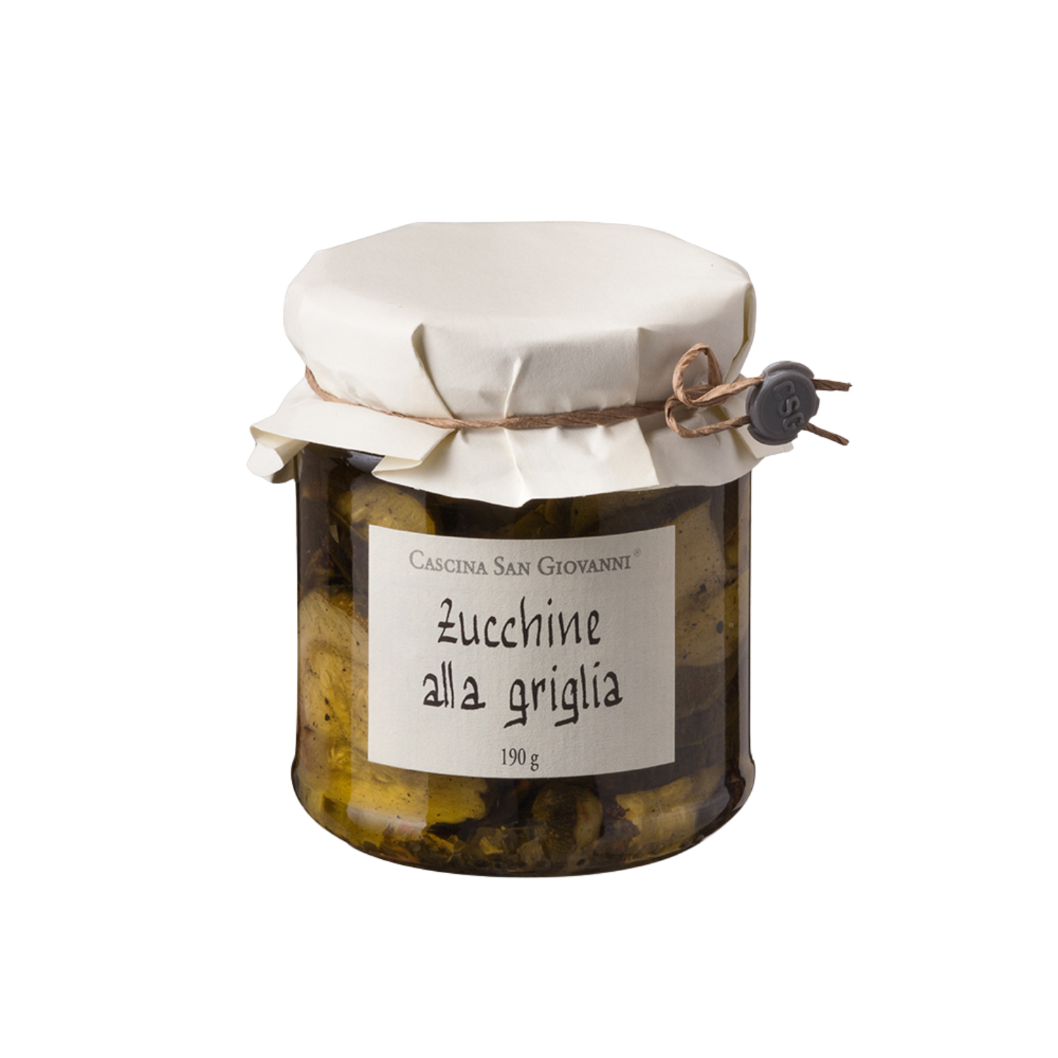 Sorgfältig gegrillte Zucchini, eingelegt in einer ausgewogenen Mischung aus Sonnenblumenöl und nativem Olivenöl extra, verfeinert mit ausgewählten Kräutern und einer Prise Salz.